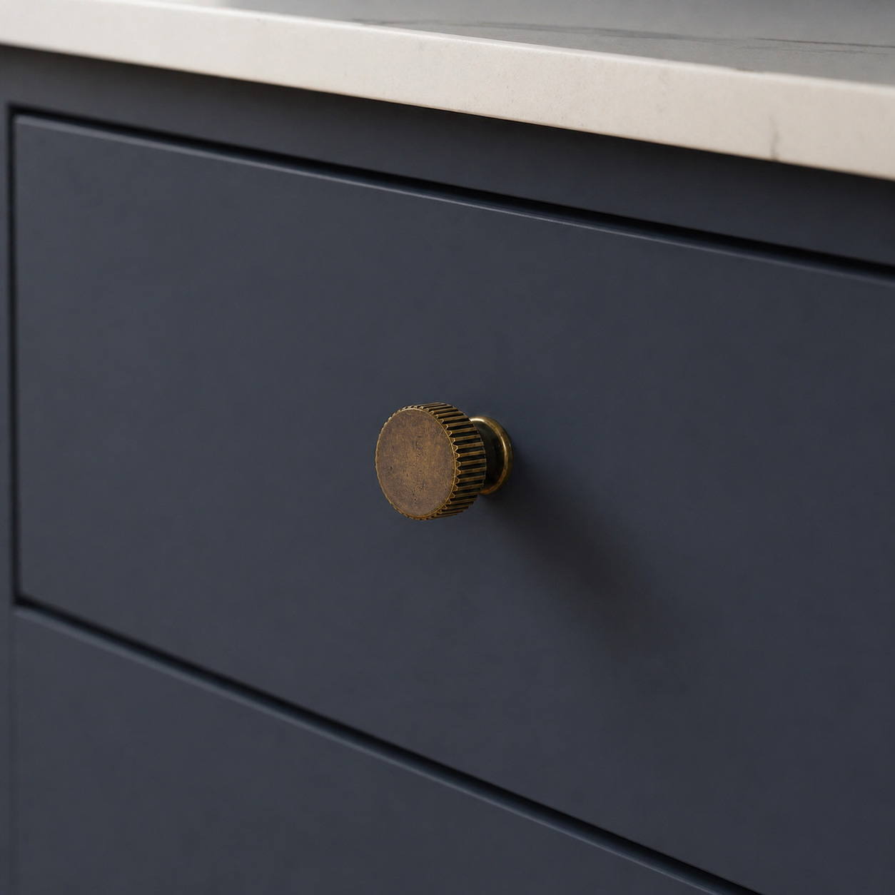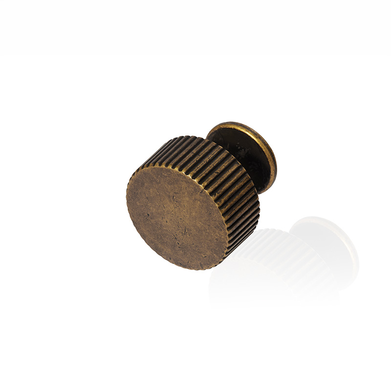 • ידית כפתור עגולה בעיצוב קלאסי ומיוחד, עם חזית חלקה ודפנות מחורצות שמוסיפות עומק וטקסטורה לרהיט.
