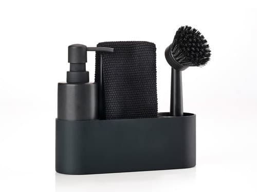 ערכת הכלים כוללת דיספנסר קרמיקה לסבון נוזלי, מברשת ומגבת קטנה. הסטנד עשוי סיליקון למניעת שריטות, פרקטי וקל לניקוי.