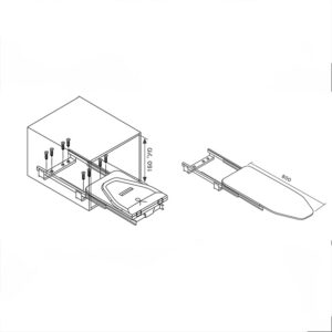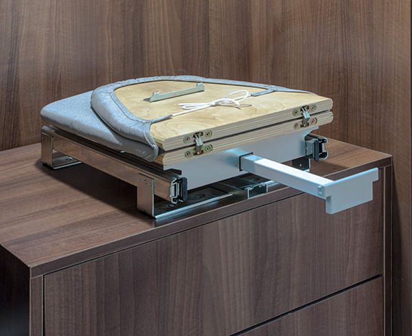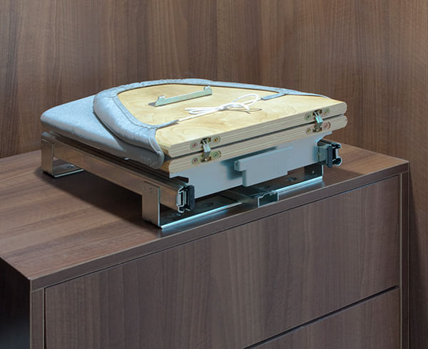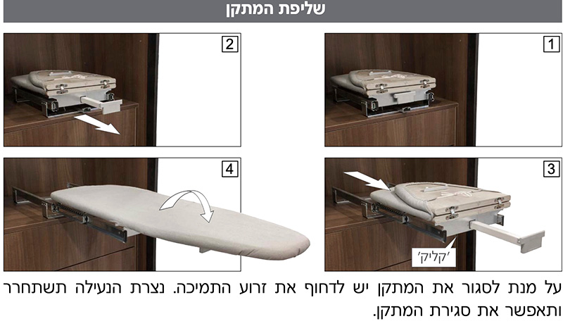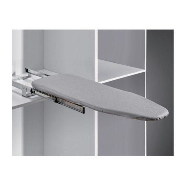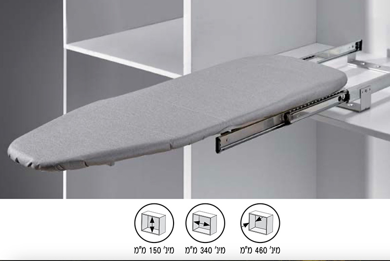 מתקן גיהוץ מתקפל איכותי עם כיסוי, חסכוני במקום וניתן לשליפה מהירה ופשוטה בעת הצורך. למתקן נצרה הנועלת אותו במצב פתוח למניעת תזוזות בעת הגיהוץ. המתקן מיועד להתקנה על מדף מקובע עם ברגים לארון.