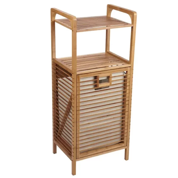 - סל כביסה עם מדפים מעוצב לאמבטיה מעץ במבוק.